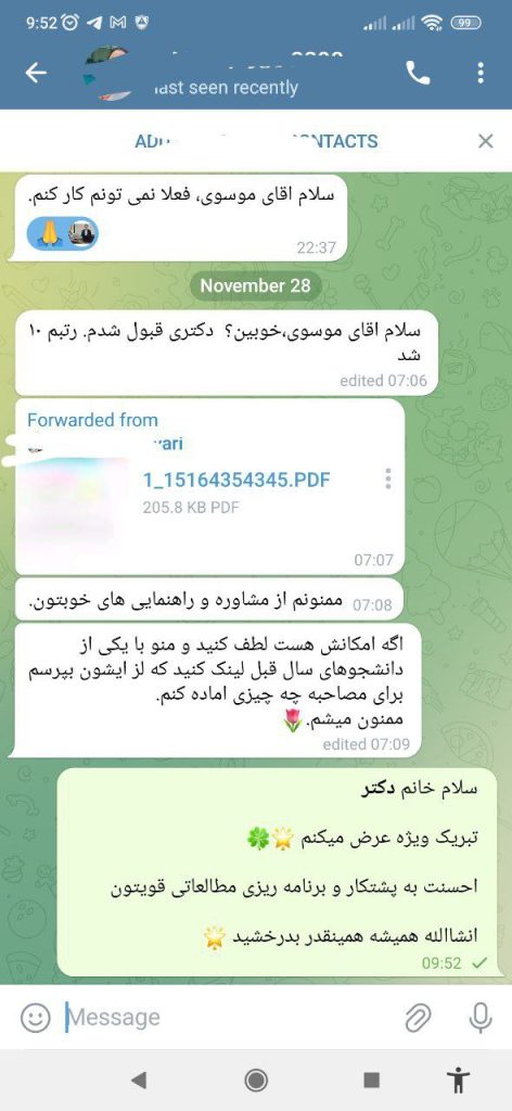 ⚠️ #قبولی_دکتری #مدیریت_اطلاعات_سلامت ✅ دانشگاه علوم پزشکی اصفهان ۱. در صورت امکان خودتون رو معرفی بفرمایید (نام و شهر) و بفرمایید رتبه چند شدین؟ سلام، من مریم محمدی هستم متولد اصفهان، امسال در کنکور دکترای مدیریت اطلاعات سلامت شرکت کردم و رتبه ۷ رو در آزمون کتبی به دست آورم و رتبه نهاییم بعد از مصاحبه ۳ شد. ۲. دانشگاه مقطع تحصیلشون در کارشناسی ارشد کجا بود؟ من مدرک کارشناسی مهندسی فناوری اطلاعات از دانشگاه اصفهان دارم و در مقطع کارشناسی ارشد به رشته فناوری اطلاعات سلامت تغییر رشته دادم و در دانشگاه علوم پزشکی اصفهان کارشناسی ارشدم رو گذروندم. ۳. چه سالی از کارشناسی ارشد فارغ تحصیل شدین؟ ورودی ۹۸ بودم و خرداد ۱۴۰۱ فارغ التحصیل شدم ۴. چند ماه برای کنکور درس خوندین؟ برای کنکور دکترا حدود ۲ ماه خوندم. البته سال قبل هم در کنکور دکترا شرکت کردم و رتبه ۲ رو در آزمون کتبی به دست آوردم اما چون دانشگاه علوم پزشکی اصفهان سال قبل دکترا نمیگرفت در مصاحبه شرکت نکردم. ۵. چه پیشنهادی برای کنکوریای سال بعد دارین؟ پیشنهادم اینه که سعی کنند رزومشون رو قوی کنند و مقاله و طرح و … داشته باشند و روی نمره کتبی و رزومشون تمرکز داشته باشن که نمره خوبی کسب کنند چون مصاحبه یه مقدار پیشبینی نشده هست و معلوم نیست چه سوالاتی ازشون میپرسند. با این حال بهتره سعی کنند در زمان مصاحبه هم با آمادگی روی پایان نامه و مطالبی که برای آزمون خوندن و با اعتماد به نفس شرکت کنند. ۶. اگه مایل هستین امکانش هست درصد هاتون بگین؟ مدیریت و سیستم های اطلاعات سلامت نمره خام ۴۳ نمره تراز ۶۶ فناوری اطلاعات نمره خام ۶۰ نمره تراز ۸۶ زبان عمومی و تخصصی نمره خام ۴۹ نمره تراز ۶۲ |